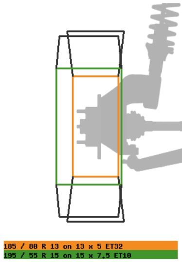 Le schéma jaune à droite représente la jante stock avec son pneu, la figure verte, la jante souhaitée avec son pneu.